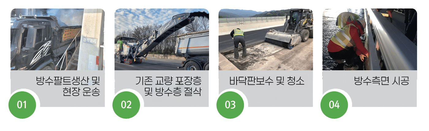 기존 포장 기술을 접목하여 시공되어 기존 개질 아스콘과 교면방수 보다 뛰어난 성능 발휘