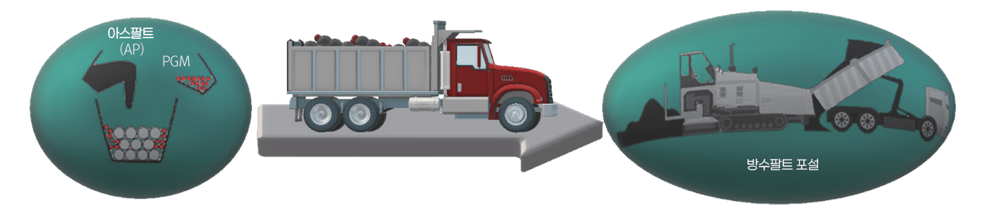 탄성 고분자 혼합물(PGM)을 이용한 밀입도 아스콘 제조 시에 혼입하여 BZ 방수팔트 형성